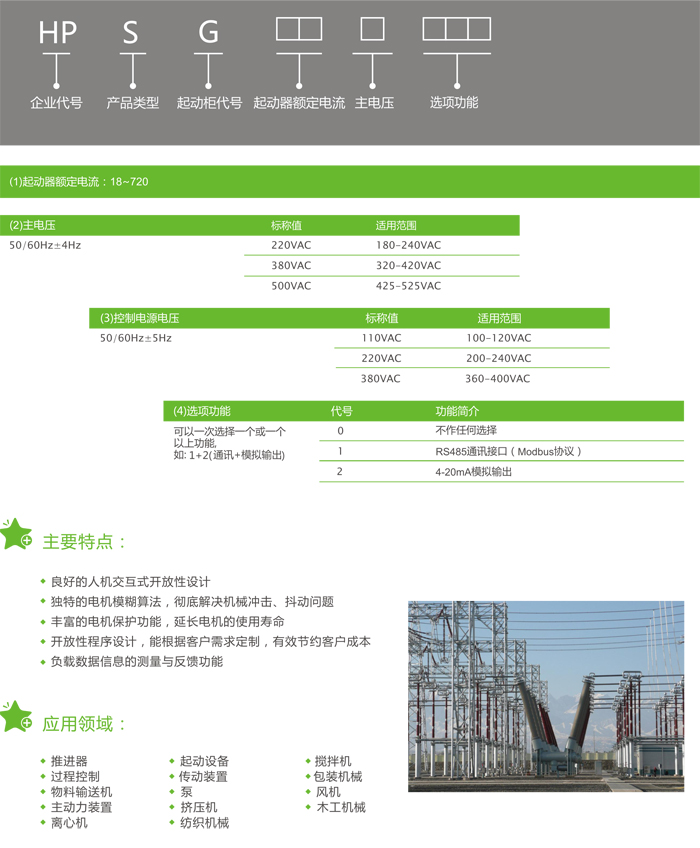 HPSG列通用型軟起動控制柜是以先進的智能化數(shù)字式電動機軟起動器為主要控制件并配有保護型主回路進線斷路器、旁路接觸器于一體 ,可實現(xiàn)多重保護的單臺電機控制裝置。