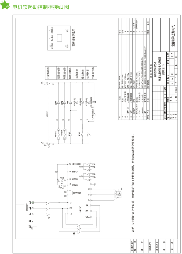裝置內(nèi)置HPISD型軟起動器,并設有起動,停止按扭及運行、停止、故障指示。裝置內(nèi)留有遠控接點,遠控接點有起動、停止輸入接點、運行指示輸出接點、故障輸出接點(均為無源繼電器接點。具有短路保護、過載保護、過熱保護、斷相保護及大電流斷開功能。選用其它型號控制件裝置的控制功能見相應的軟起動說明書。