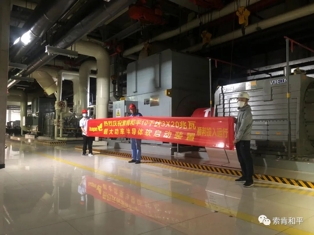 2020年5月20日,在索肯和平(上海)電氣總經(jīng)理陳勇,工程師潘工、趙工、呂工,能源公司王副總經(jīng)理、電氣總工程師李總工和電氣負責人杜工等相關人員協(xié)同下,20兆瓦級高壓固態(tài)軟起動裝置一次啟動完美成功,代表著能源公司二期工程勝利完工。