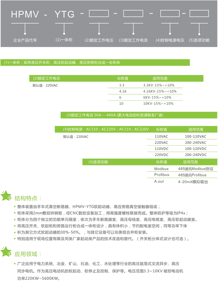 ◆ 整體裝置由手車(chē)式真空斷路器、HPMV-YTG軟起動(dòng)器、高壓旁路真空接觸器組成;